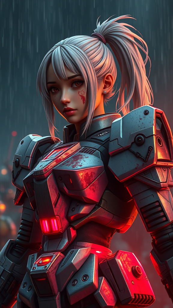 A striking scene unfolds with a girl clad in Gundam-inspired armor, showcasing battle scars across the gleaming mechanical parts. Her white hair is pulled back into a ponytail, adding contrast to the dark, rain-soaked night that envelops the battlefield. Amid the epic confrontation, she's visibly wounded yet resilient, embodying the intense and stylistic flair typical of Borderlands. This moment captures the attention of art communities, featuring intricate details, cinematic prowess, and a stunning environment. The atmosphere is surreal, invoking a celestial beauty reminiscent of high-end manga and anime. Every facet is elaborately colored, with dramatic lighting enhancing the hyperrealistic focus. Utilizing the power of Unreal Engine 5 and Octane rendering, the scene glimmers with Lumen reflections, creating an unreal yet divine visual feast. Despite damage and adversity, the girl's presence is commanding, evoking a sense of celestial resilience amidst a hyper-detailed, vibrant atmosphere.