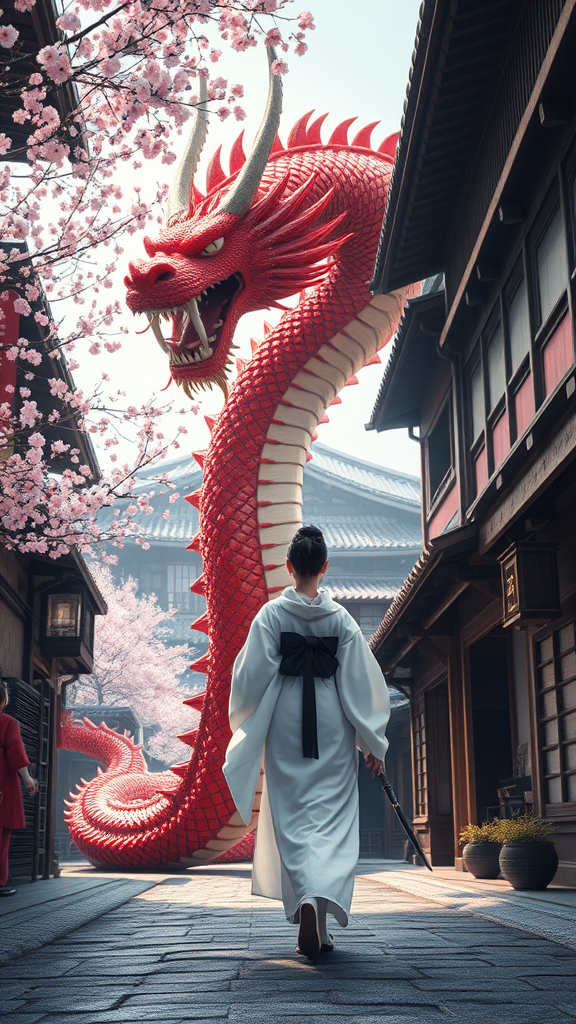 A figure in an elegant white kimono gracefully walks through the historic streets of Kyoto, cherry blossoms swirling gently in the crisp air. Clutching a finely crafted katana, they pause before a majestic red dragon, its scales shimmering under the dynamic play of light and shadow. This setting, reminiscent of Studio Ghibli's enchanting worlds, captures the essence of ancient Japan during the Edo period with astonishing detail and magical realism.