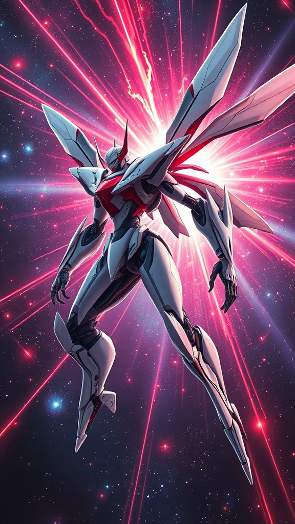 portrait:2, futuristic Sci-fi mech in a streamlined design, slender and poised in a dynamic combat stance, featuring glossy white and red detailing with max intricacy, inspired by insectoid aesthetics, equipped with Sci-fi wings. Influences of Tsutomu Nihei and Akira are evident in the art style, set against the vivid backdrop of a radiant space phenomenon like a quasar in outer space with a dramatic atmosphere. The scene is enhanced by the cosmos filled with stars and quasars:3, with intense beams and explosive plasma waves, plasma streams. Rendered in stunning 8k UHD quality, the artwork is a fusion of anime and hyper-realism, showcasing complex lighting and a brilliant flash. The composition is in an aspect ratio of 9:16.