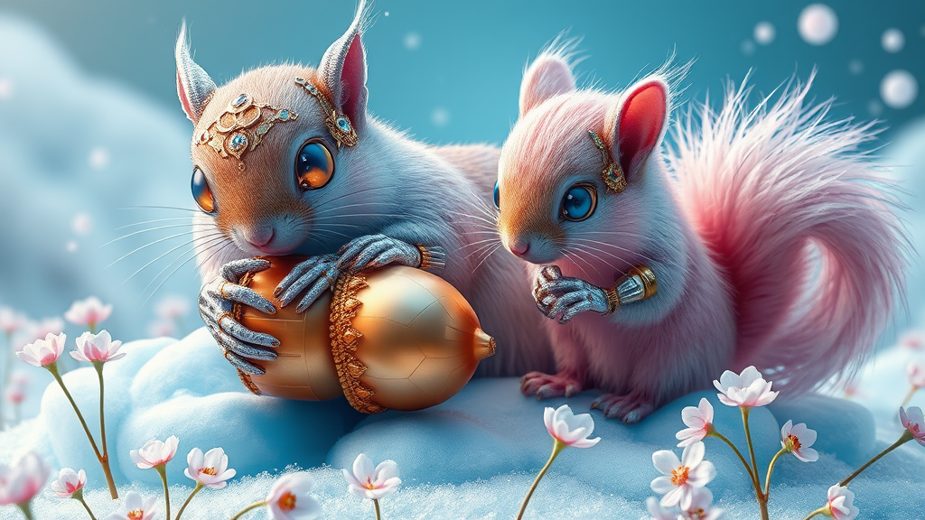 Cyber Bling art inspired by the 'art of control' collection by Jasper Harvey, featuring futuristic optics with silver and gold tones, and intricate facial details, surrounded by swirling vortexes. Envision whimsical cyborgs crafted from shimmering crystals, resting on a blue cloud. A fluffy squirrel with pastel pink fur clutches a substantial golden acorn. As it slips from her grasp, it descends into a pristine white clearing adorned with delicate pink snowdrops. The scene exudes a sense of raw style, enhanced by the surreal, 3D elements that bring it to life.