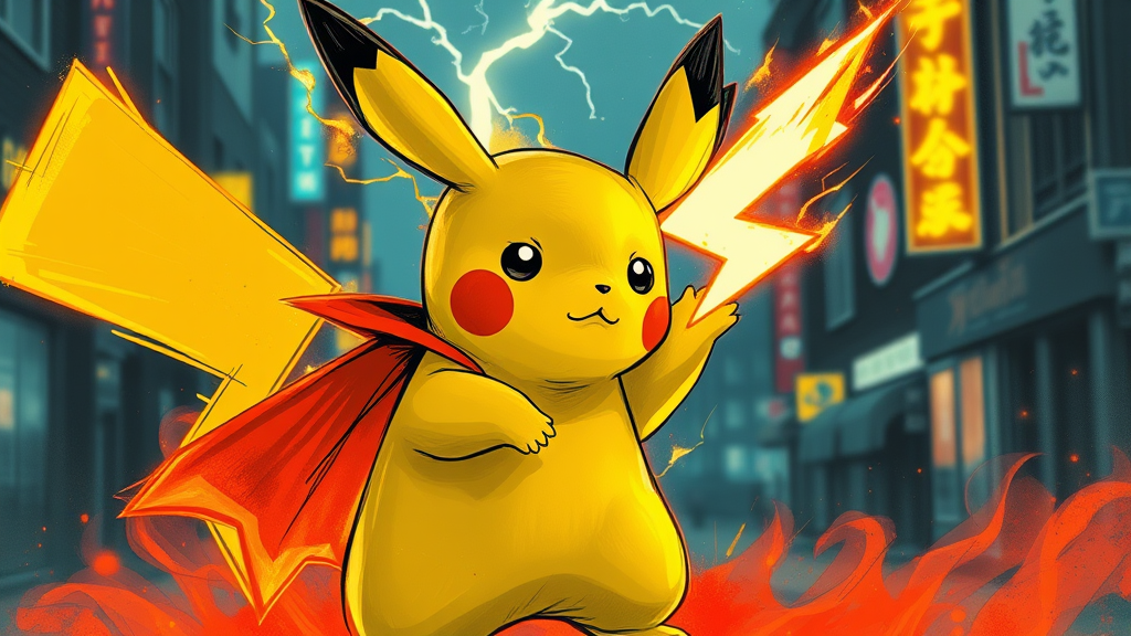 Imagine a dynamic portrayal of Pikachu, captured in an active and expressive pose, echoing the spirited essence of anime sketch artistry. With inspirations drawn from nvinkpunk, this vision features abstract brush strokes and vigorous lines, all presented in an HDR Neo-Noir style. Illuminate the scene with striking neon yellows, introducing a minimal yet captivating devilish allure emanating from a fiery cape. The proportions are elegantly balanced, embracing the Cyberpunk Edgerunner aesthetic, set against a late-night backdrop that breathes fire amidst cold chaos. A strong contrast enhances this distant view, rendered in pristine 8K quality, where flickers and tender imagery meet. Influences from artists like Loish and Jeremy Mann shape a full-body character sheet, depicting a lightning wave of 3D and CG brilliance. This glowing neon tribute to cyberpunk showcases the edgy beauty of a digital realm, ensuring Pikachu stands electrifyingly apart from the mundane. The theme softly echoes a sense of ethereal flicker against a vivid backdrop, merging elements of tender chaos and structured beauty.