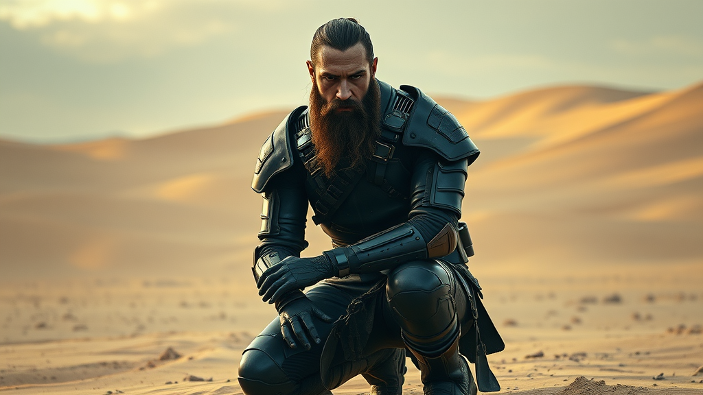 A highly detailed full-length portrait of a bearded man clad in sleek sci-fi leather armor, depicted kneeling in a vast desert setting. The scene, infused with a gothic ambiance, showcases cinematic lighting that emphasizes the intricate details of his face. This digital art piece is a striking example of character design and concept art, capturing the essence of a futuristic warrior. Despite its low resolution, the artwork avoids common pitfalls such as jpeg artifacts, poor anatomy, or disfigurations. The portrayal is free of extra limbs or digits, maintaining a realistic and engaging depiction, clean of any watermarks or distracting signatures.
