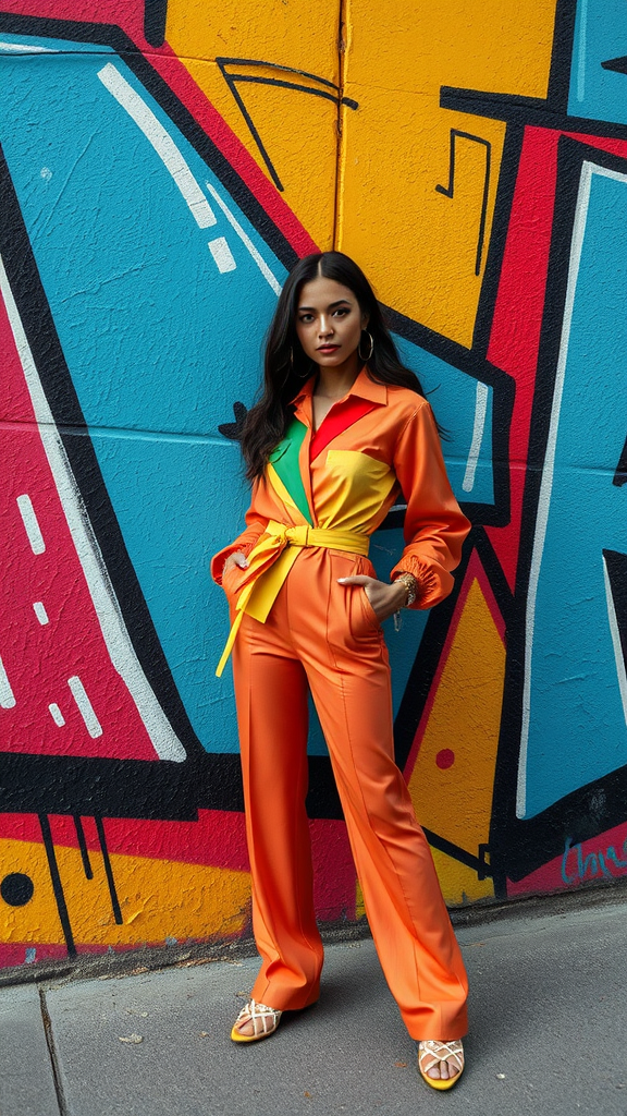 A 1990s street photographer in Santiago captures a self-assured model posing against a vibrant backdrop of abstract graffiti composed of bold, colorful geometric shapes. The model wears an outfit that flawlessly merges color and form, featuring intricate details reminiscent of Tokyo Fashion Week, adding a sense of urban chic to the scene.