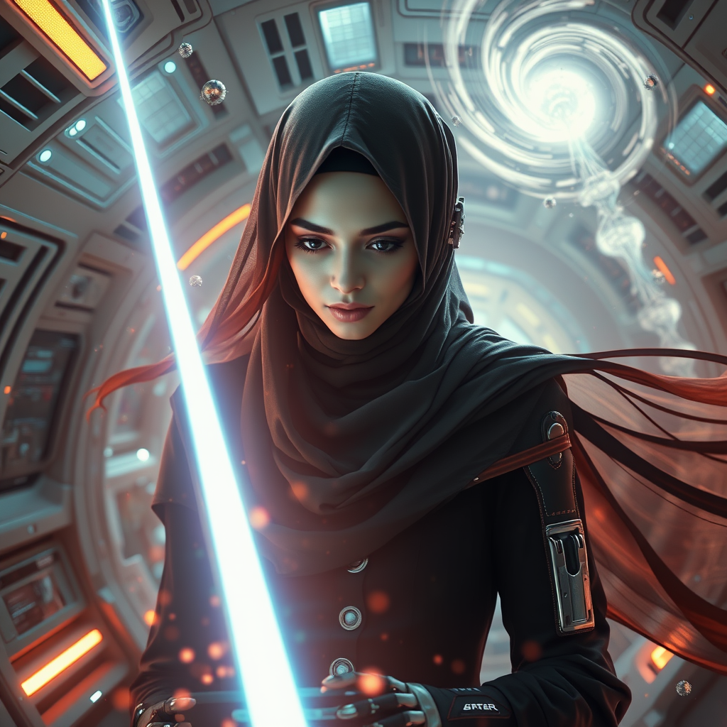 Hijabi Muslim girl with cybernetic prosthetics, adorned in futuristic Islamic attire, with flowing long hair, inside an advanced spaceship setting. The scene is rich with sci-fi elements, hyper-detailed and photorealistic, capturing a cinematic feel. A pulsating laser is the focal point, originating from both the center and descending from the sky, interacting with swirling energy clusters. The environment is depicted with a sense of acceleration, bright light flashes, and a distinct sense of speed. The imagery is akin to a high-definition, super-resolution painting, with an emphasis on vibrant colors and dramatic lighting effects, maintaining an ultra-realistic, 8K quality, and a wide dynamic range capturing every nuance.
