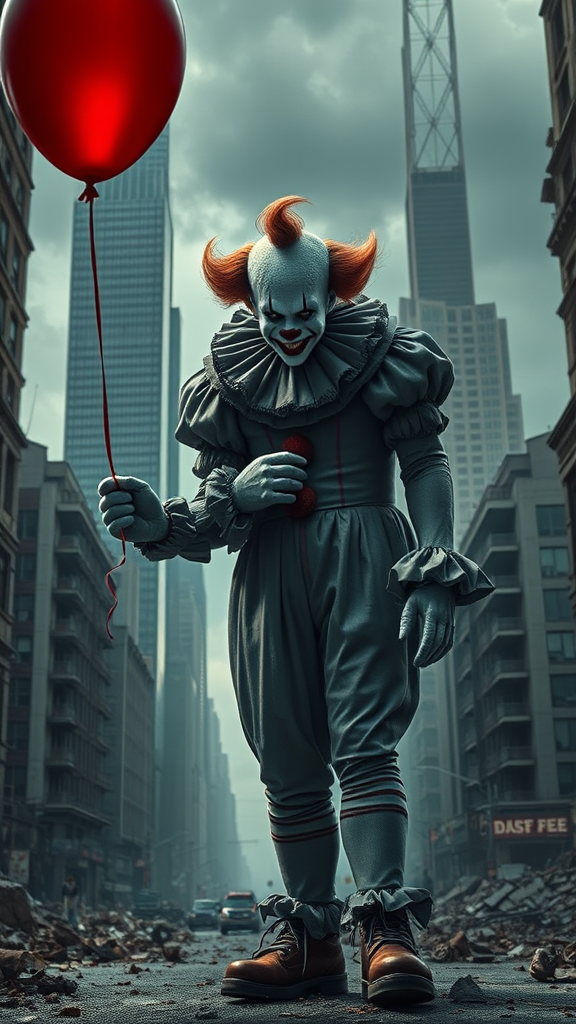 A sinister clown with a haunting smile, holding a vivid red balloon, stands amidst a dystopian landscape of crumbling skyscrapers and ruined city streets. The scene, reminiscent of a post-apocalyptic chaos, captures the eerie essence of the IT movie, depicted with photorealistic detail and atmospheric tension.