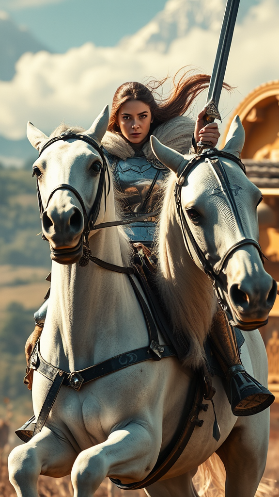 Medieval female knight in action, galloping on a majestic white horse, striking a heroic pose, with intricately detailed face and expressive eyes, masterpiece, top-tier quality, 8k, photorealistic, by the artistic style of Jeremy Mann, Sandra Chevrier, and Maciej Kuciara, sharp and lifelike, with authentic shadows, wielding a gleaming sword, vibrant and dynamic scene, the armor reflecting the sunlight, surrounded by a lush medieval landscape, her cape flowing in the wind, evoking a sense of noble courage and elegance.