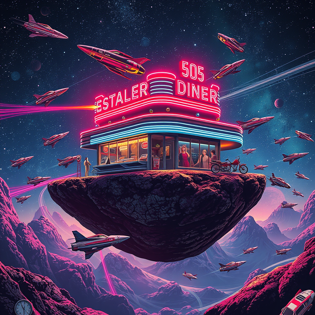 A vibrant retro sci-fi scene featuring a 1950s-style diner perched on an asteroid, surrounded by a bustling array of sleek flying cars zipping through the starlit sky. The diner's neon lights cast dynamic, kaleidoscopic hues across the asteroid's surface, contrasting with the celestial backdrop of twinkling stars and swirling cosmic dust. Intricate details adorn the scene, from classic chrome finishes on the cars to the diner's retro-futuristic architectural design. Rich, colorful lights dance across the landscape, creating a lively atmosphere that blends nostalgia with the boundless energy of space, all captured in stunning 4K clarity.