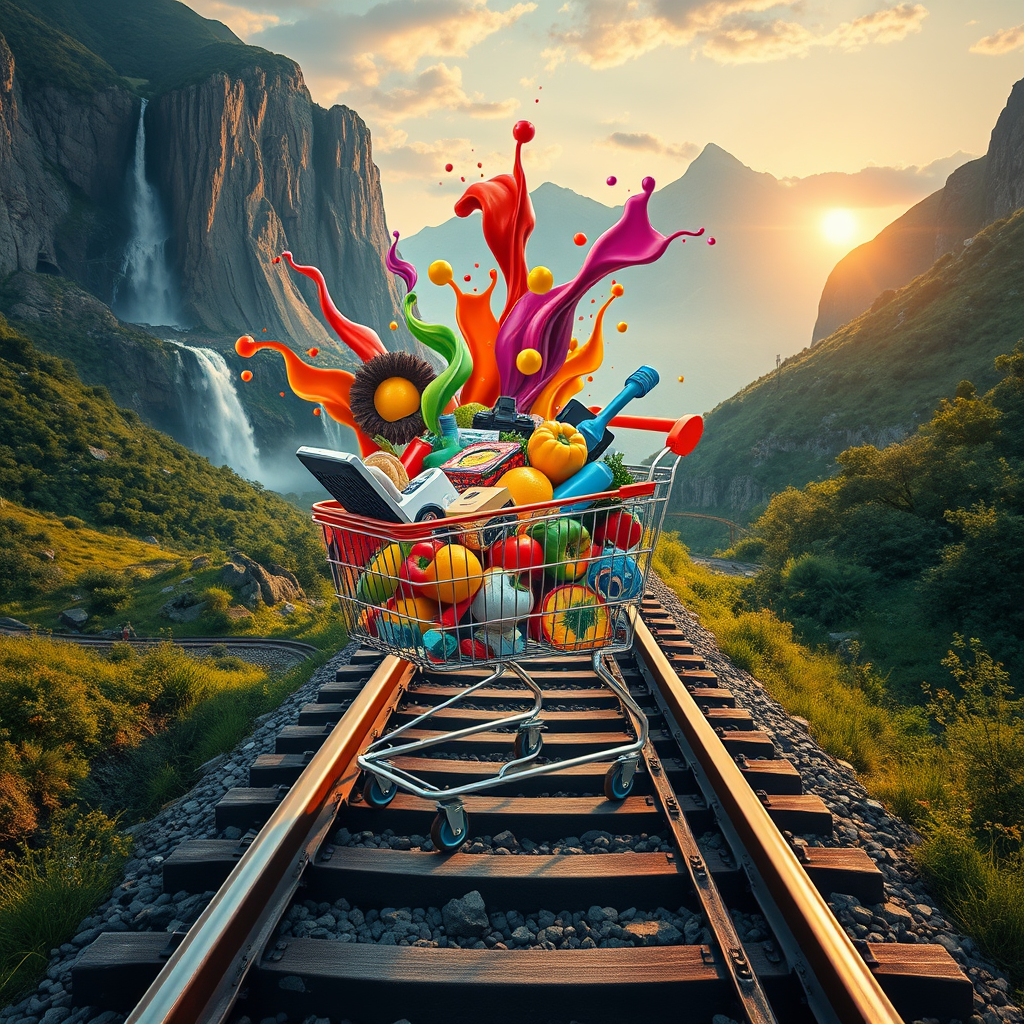 Create a hyper-realistic and vibrant image of a surreal scene set on a dramatic railway track cutting through a picturesque mountainous landscape with lush greenery and cascading waterfalls. A shopping cart is dynamically perched on the rails, overflowing with an explosion of colorful items symbolizing e-commerce abundance. The cart brims with fresh fruits, vegetables, electronic gadgets, household items, and whimsical splashes of bright, paint-like textures trailing into the sky. The objects appear to defy gravity, creating a dizzying array. The setting sun casts a warm, golden light, elongating shadows and enhancing the scene's visual drama. The image should capture overwhelming vibrancy and kinetic energy with meticulous attention to detail, focusing on dynamic and colorful aspects while excluding static or dull components.