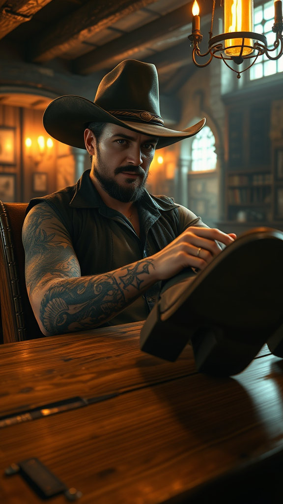 A rugged male cowboy with a wide-brimmed hat, showcasing a detailed tattoo on his arm, lounges in a medieval tavern. His boots rest casually on the wooden table, surrounded by the cozy glow of indoor lighting. This cinematic digital painting captures a hyperrealistic scene using unreal engine, featuring bright evening light that highlights the intricate textures of the environment. The concept art embraces a 4k resolution with photorealistic attention to detail, inspired by an arcane style. The atmosphere is warm and inviting, emphasizing the cowboy's enigmatic presence in this anachronistic setting.