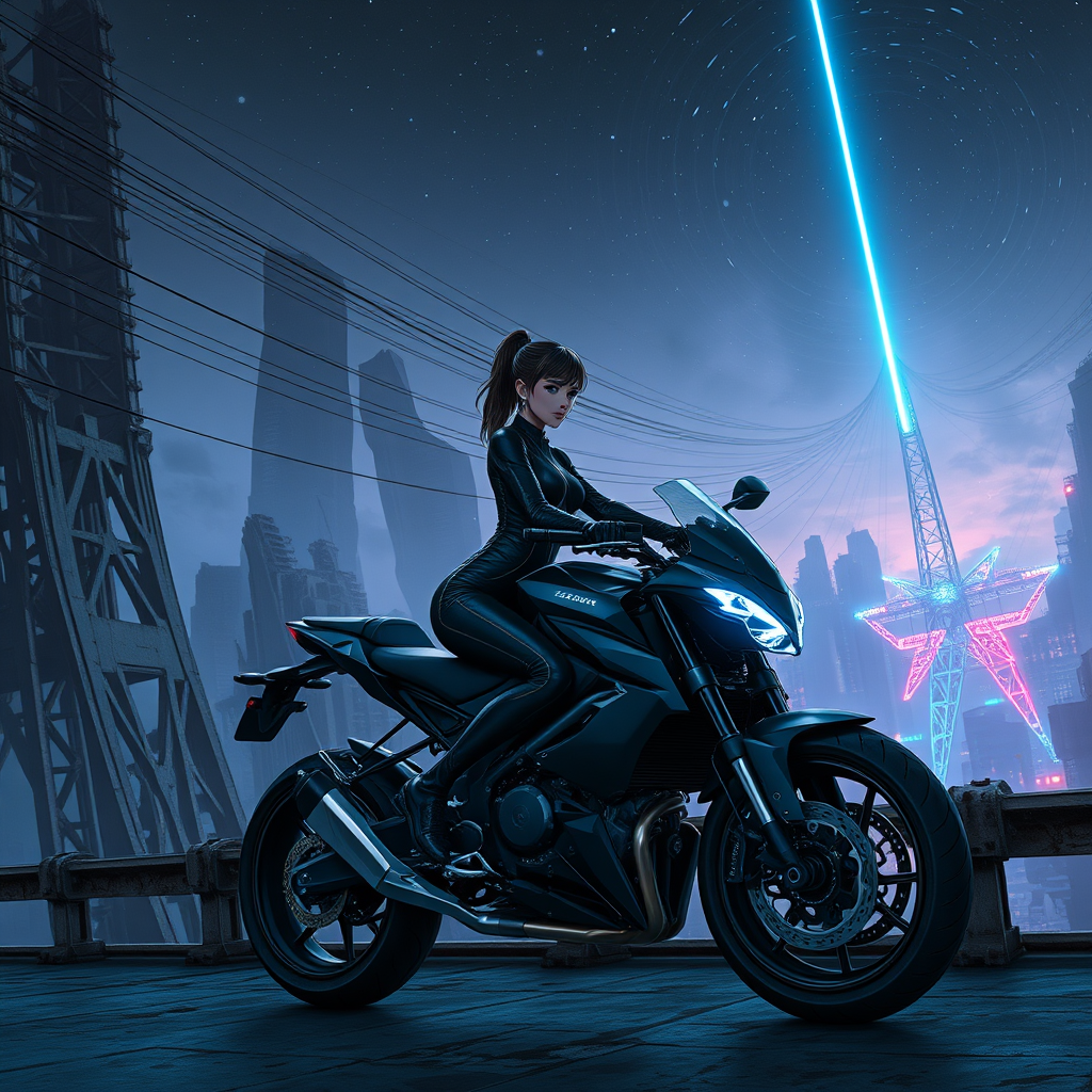A young woman in a form-fitting sci-fi jumpsuit sits astride a sleek futuristic motorcycle, poised on a massive, weathered bridge. The backdrop reveals a dystopian cityscape of towering, crumbling skyscrapers, exuding a sense of melancholic grandeur. The scene is cloaked in darkness, reminiscent of Tsutomu Nihei's stark artistry, while colossal structures loom in the shadows. The environment is futuristic and multi-layered, illuminated by intricate, neon-lit power lines that crisscross the sky, casting ethereal glows against the starry night. The aesthetic breathes life to manga graphics, with a somber yet striking dark exposure. In the distance, a brilliant blue energy beam cuts through the horizon, accompanied by the pulsating glow of blue neon lights that evoke a sense of otherworldly technology. This vivid imagery embodies the highest quality and detail, captured through the lens of anime drawing, viewed from the side, in stunning 8K, Full-HD resolution, echoing the raw, surreal beauty of plasma arcs.