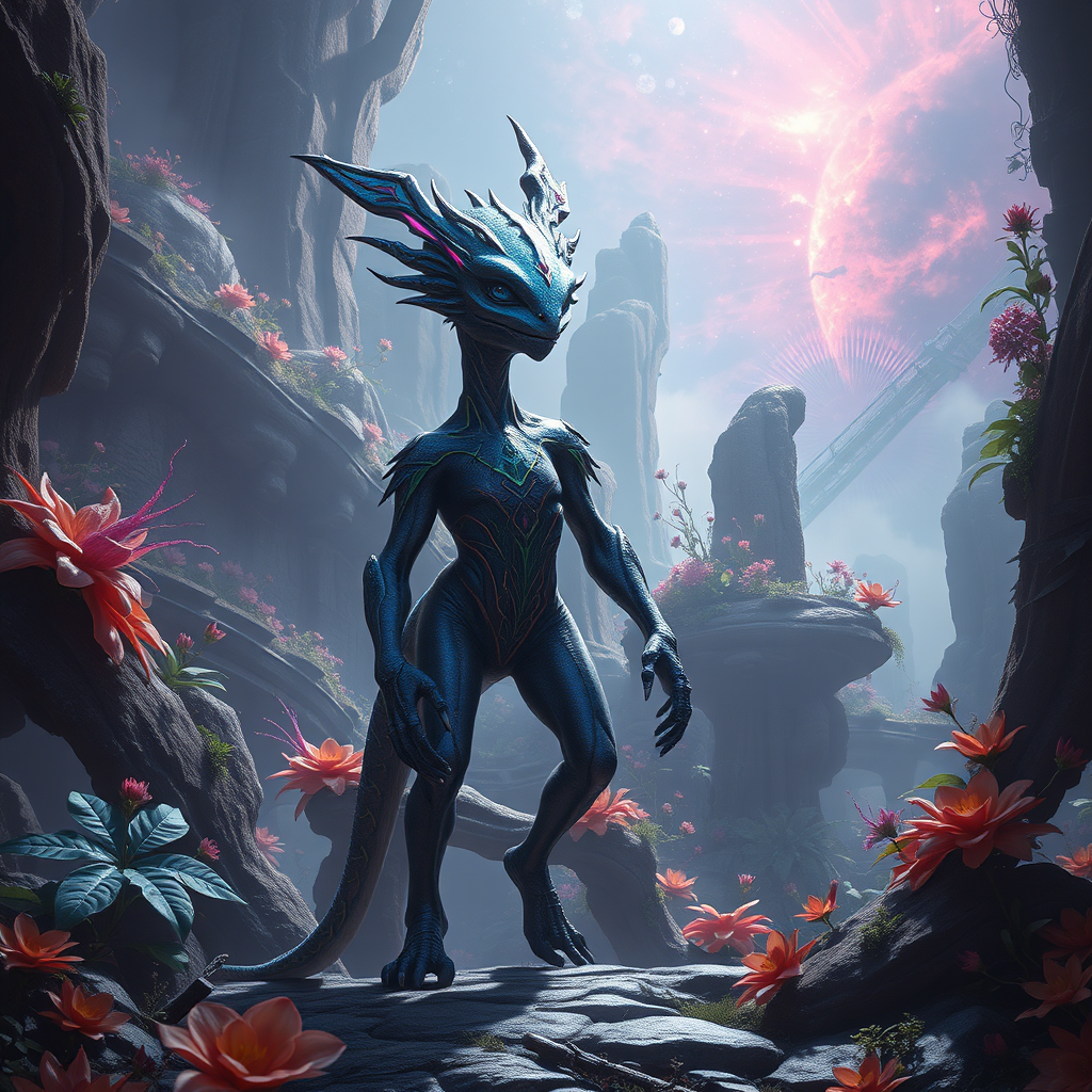Full body portrait of a stunning fantasy being, captured with glossy, professional photography, a true masterpiece rendered in ultra-high detail similar to Unreal Engine. Set on a fantastical planet, the scene is an enchanting reverie inspired by the artistry of Jean Ansell, Justin Gerard, and Greg Rutkowski. It features dynamic lighting that illuminates lush flora and exotic fauna, creating an immersive, cinematic atmosphere. The setting is among ancient, timeworn ruins enveloped by vibrant nebulas and mysterious mist. The creature, with iridescent features, stands amidst a vivid display of mythical biodiversity, evoking an otherworldly charm and timeless elegance.