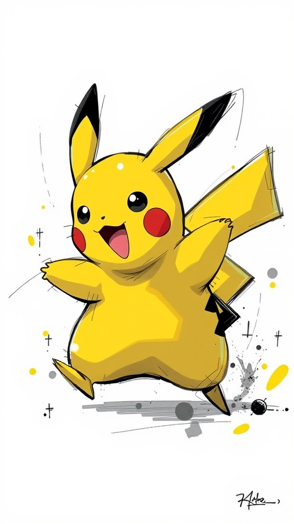 Pikachu in dynamic stance, anime-inspired, energetic sketch, nvinkpunk influence, abstract brushwork, bold contours, HDR Neo-Noir aesthetic, vivid neon yellow accents, minimalist essence.