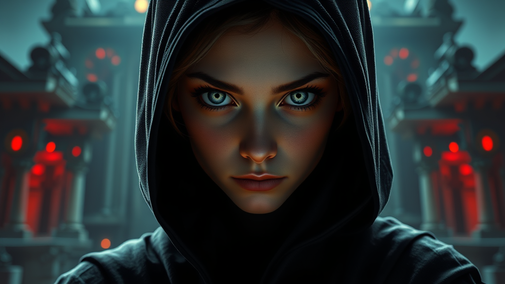 1girl, wearing dark robes, star wars theme, temple background, symmetrical eyes, dramatic lighting, realistic, sharp focus, HD, highly detailed, intricate, photography, hyperrealistic, raytracing, physics-based rendering, portrait of a sith lord from STAR WARS, wide angle, sharp focus, concept art, extreme details, full body shot, cinematic, color grading, deep depth of field, beautifully color-coded, insane detailing, dressed in dark robes, moodily lit, hyper-detailed, Unreal Engine, editorial quality, shot with 70mm lens, optimized shutter speed and aperture, balanced white balance, super-resolution quality, professional photography standards, realistic lighting, atmospheric lighting effects, fusion of studio, natural, and volumetric lighting techniques, stunning backlighting, explicit ray tracing reflections, volumetric shadows, chromatic effects, post-production refinements, intricately painted concept art, elegant design elements, vibrant full color, fine ambient occlusion, 3D render, cartoonish anime touches, digital art influence.