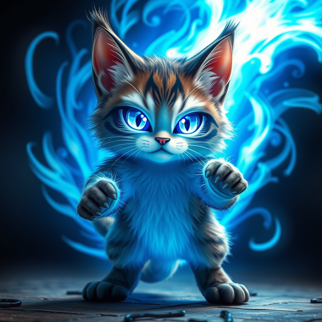 An anthropomorphic adorable feline with gleaming Sharingan eyes stands in a dynamic battle stance, its paws clasped together, radiating an intense, bright azure light. The cat is enveloped in a swirling blue aura, projecting a sense of immense power and energy. Fine details accentuate its fur, capturing the vibrancy and determination in its expression. The scene is framed in an ultrawide, cinematic style, evoking the grandeur of an epic movie moment.