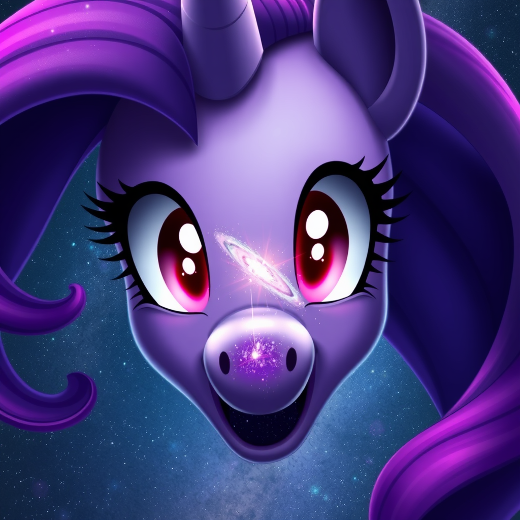 Enormous Twilight Sparkle from My Little Pony, larger than a galaxy, majestically floating through the vastness of space; a tiny galaxy hovering before her slightly parted lips, her eyes wide open and glowing a vibrant crimson. Her mane billows like cosmic waves, shimmering with stardust, while her expression is a mix of curiosity and intent. In an extreme zoomed-in perspective, her mouth becomes a gateway to infinity as she gently engulfs the luminous galaxy, depicting a surreal cosmic encounter with hyper-realistic detail.