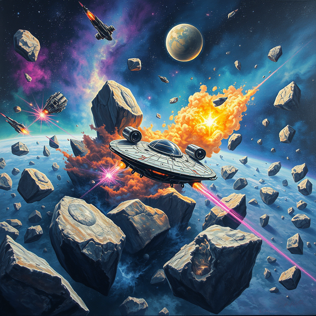 A vibrant and intricate painting of an alien spacecraft navigating through a dense asteroid field, featuring a nimble spaceship deftly avoiding the rugged asteroids. The scene is set in the vast, cold emptiness of space, illuminated by distant stars and adorned with colorful gas clouds and meteorites. The composition captures the unique style of BelleDeesse, merging fantastical elements with cosmic realism, evoking a sense of awe and adventure amidst the celestial expanse.
