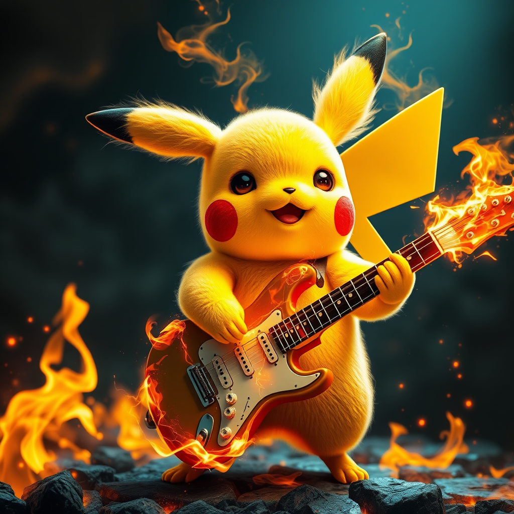 A hyper-realistic Pikachu with shimmering, lifelike fur and sparks of electricity dances among flames, passionately strumming a flaming electric guitar, its eyes gleaming with intensity and musical fervor as heat waves distort the air around it.