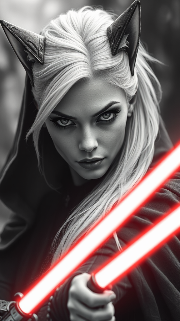 Female Sith lord from STAR WARS, striking white hair, cat-like ears, mesmerizing and beautiful face, hyperdetailed and masterful artistic representation, captured in 8k resolution. She is in a dynamic and commanding pose, set within an immersive and atmospheric background. The scene is rendered in monochrome and grayscale, utilizing depth of field for added realism. Avoid bad anatomy and poor artistic execution while focusing on an intricately detailed and captivating portrait.