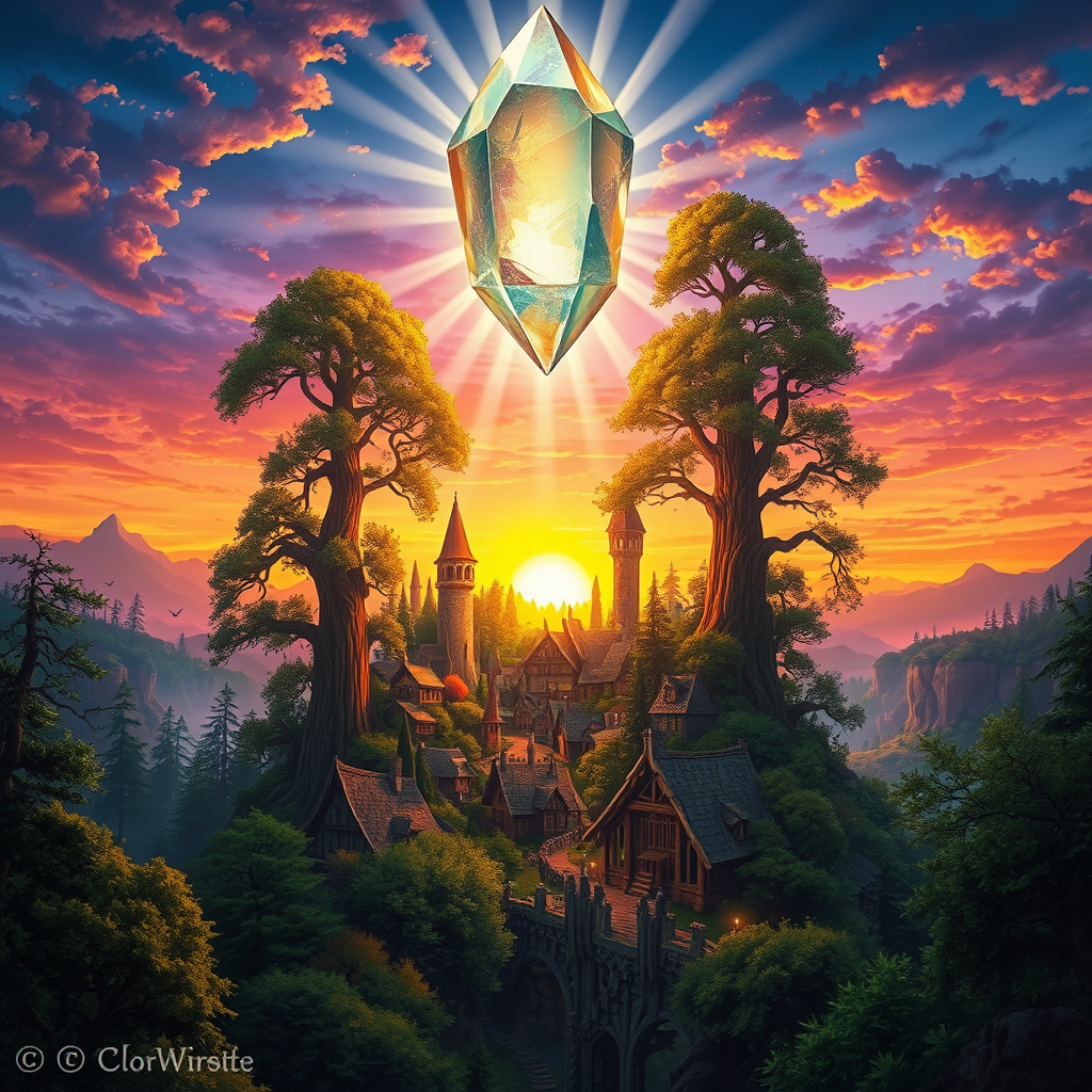 A mesmerizing digital painting of a vibrant sunset over an enchanting city nestled within towering trees, featuring rustic wooden buildings with elements of fantasy and medieval architecture. Above the city, a colossal, luminous crystal hovers in the twilight sky, casting radiant beams that shimmer through the treetops and illuminate the intricate landscape below. The scene is bathed in a warm color palette, enhancing the mystical ambiance of this otherworldly haven. The sky is painted with hues of amber and lilac, contrasting with the verdant greens of the forest, harmonizing nature with magic in a breathtaking spectacle.