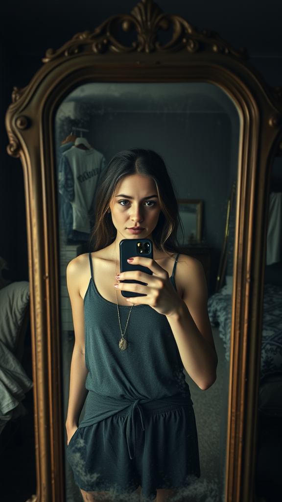 A young woman stands before a dusty, vintage mirror, snapping a selfie. The image is slightly pixelated, with a gentle haze blurring the finer details. Dim lighting casts deep shadows, partially veiling her expression. The room is chaotic, with garments draped over a chair and a quilt haphazardly thrown on an unmade bed. Her expression is focused yet relaxed, while an old smartphone labors to maintain clarity, lending the photo a genuine, unrefined quality. Smudges and fingerprints adorn the mirror, enhancing the candid, ordinary ambiance of the moment.