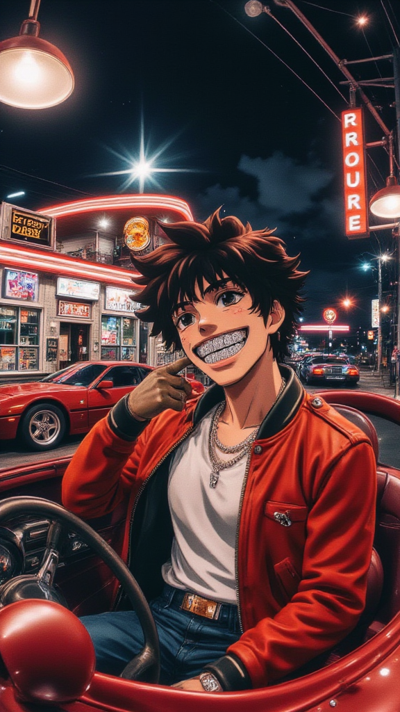 hes wearing gr!llz in his mouth with a large smile, vintage anime diner, man driving a red ferrari parked outside, wearing a letterman jacket and leather gloves, neon lighting, retro