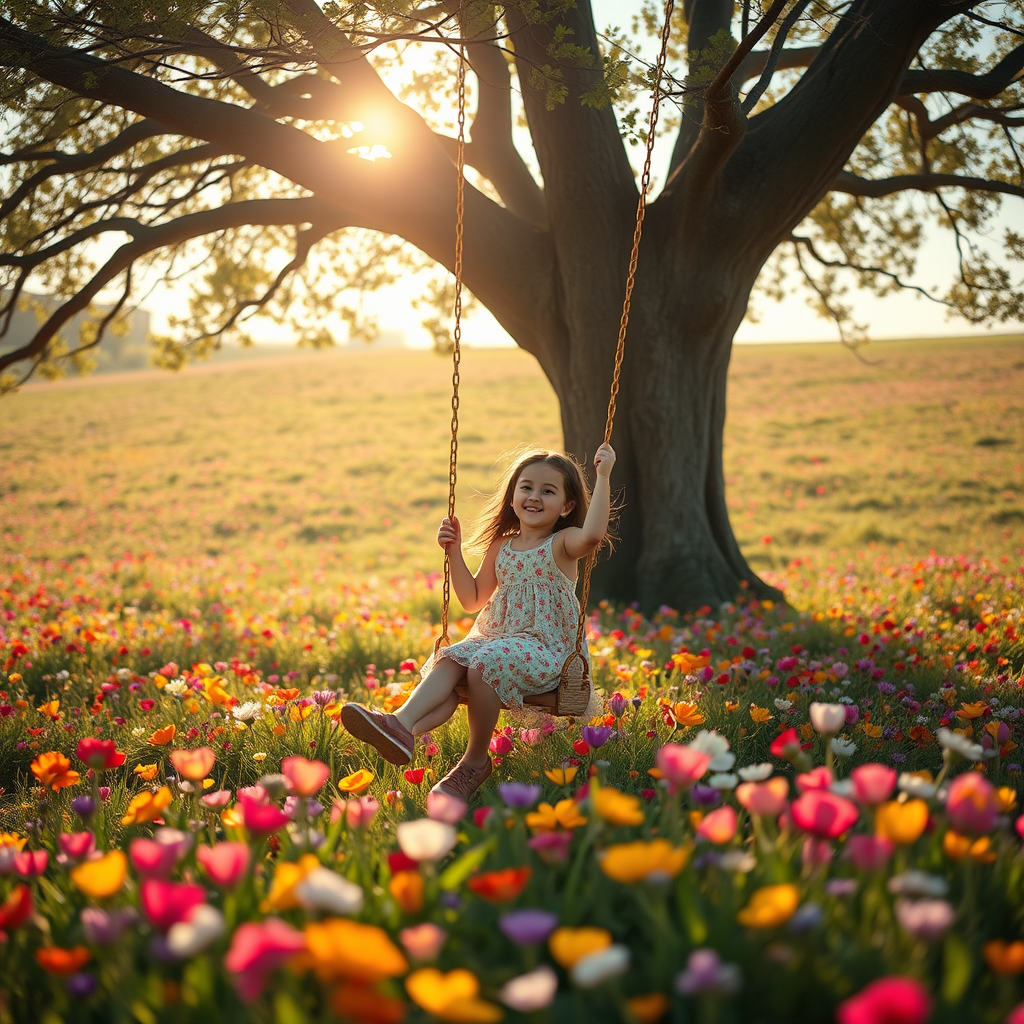 A stunning image of a young girl joyfully swinging under a majestic tree, enveloped by an expansive meadow brimming with vibrant, colorful spring flowers. The scene is illuminated with soft, volumetric lighting, creating an enchanting ambiance. Despite being a low-resolution image, the charm remains unaffected by text overlays or digital errors, displaying perfect anatomy with no oddities such as extra or missing limbs. The composition is gracefully framed without cropping issues, capturing every delightful detail without the presence of visual artifacts or distracting marks. The artwork maintains its purity, avoiding any semblance of poor quality or disturbing elements, while delivering a beautifully serene and picturesque snapshot of nature's wonders.