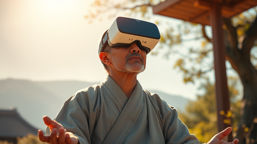 A zen monk peacefully meditating under the bright outdoor sun, wearing traditional zen robes paired with a VR headset, highly detailed in an ultra-realistic oil painting style reminiscent of Greg Rutowski, Yoshitoshi, and Studio Ghibli. The scene bursts with vivid colors and dramatic cinematic lighting, capturing an ethereal harmony between ancient and modern elements, evoking tranquility amidst technological advancement. The textures are rich and lifelike, highlighting the serene expression of the monk, surrounded by a lush, sunlit landscape, offering a juxtaposition of tradition and innovation.