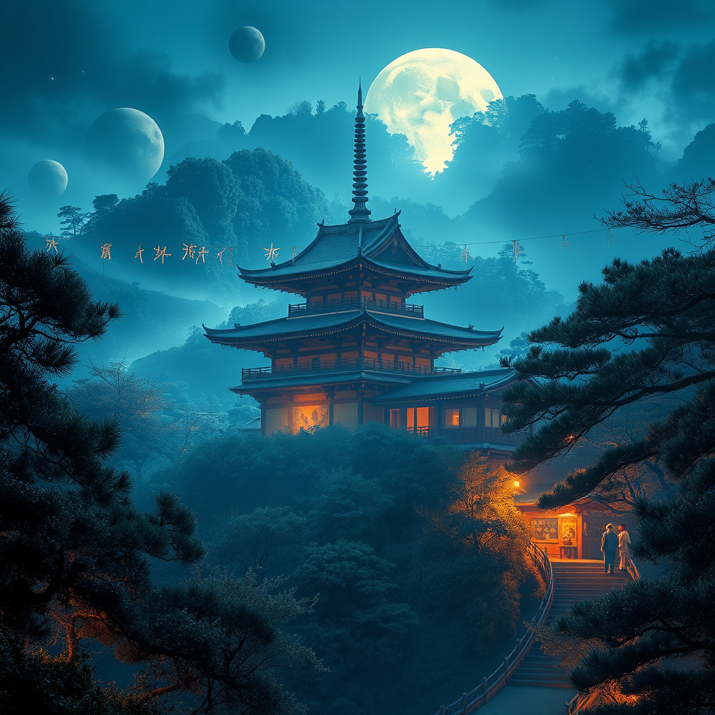 illuminated japanese landscape, ancient temple nestled among trees, vibrant fantasy lighting, intricate details, artstation quality, panoramic aspect ratio with a 2:1 ratio, ethereal atmosphere, rich textures, serene and mystical ambiance