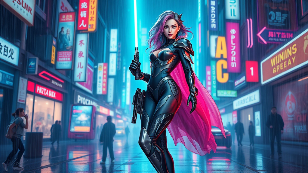 A breathtaking 8k full-body artwork showcasing a futuristic female in sci-fi armor, illuminated by neon lights. She exudes an alluring charm with her big, expressive eyes and multi-color glowing hair, set against a vibrant cyberpunk cityscape drenched in rain. Carrying a laser saber and a sci-fi gun, she stands confidently, ready for action with a playful smile. Her attire includes a transparently flowing cape and sleek latex that accentuates her form, paired with high-heeled boots that echo her assertive stance. The intricate, highly detailed oil painting features reflections and lens flares that bring a touch of nostalgia, akin to the styles of Ed Binkley, Atey Ghailan, and Studio Ghibli, combined with the photorealistic touch of Jeremy Mann and Gregory Manchess. This masterpiece brings together the complexity and high detail found in trending artworks on ArtStation and CGSociety, evoking a sense of drama and realism.