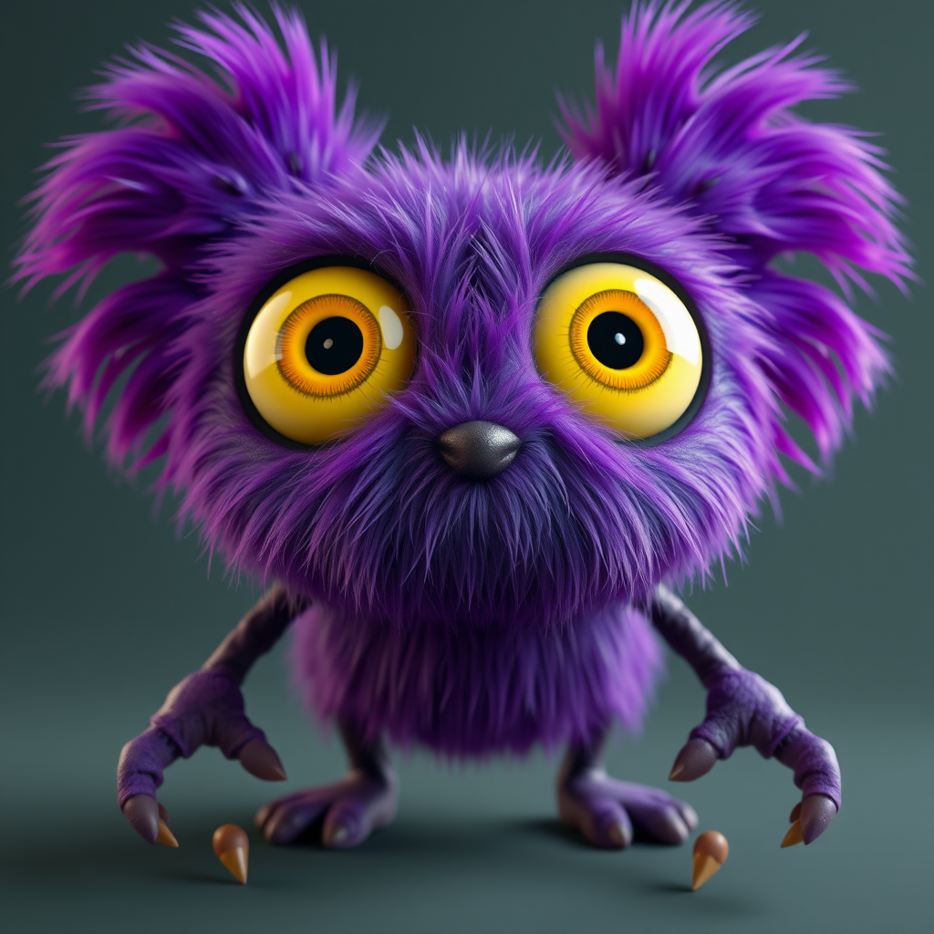 A whimsical, small, purple, furry monster with bright yellow eyes, featuring a 3D image and rendered in Unreal Engine for a dynamic, cinematic output. The creature sports realistic, plush-like fur akin to styles trending on ArtStation, with a Pixar-esque charm. Its large, expressive, circular eyes possess a glossy, fish eye art style finish, capturing a sense of innocent curiosity. With two heads and dual faces, this enchanting monster presents a unique character profile, despite the occasional surreal element like deformed or duplicated limbs adding an abstract twist. Detailed focus lays on intriguing features such as a long neck and slightly twisted fingers, creating a contrast between its lovable and unusual attributes. The body may appear elongated or feature floating, disjointed limbs, exaggerating its peculiar and charming nature. The rendering style emphasizes cinematic smoothness with intricate details, while playful imperfections such as mutated hands, cloned faces, and abstract proportions maintain a delightful fantasy feel. Despite these eccentricities, the overall presentation symbolizes a creative, animated figure, reminiscent of toy-like characters but with a decisive edge of animated realism.