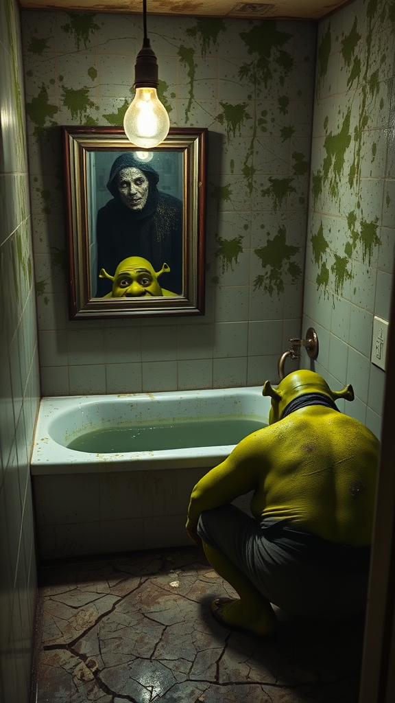 In an old, grimy bathroom of a forgotten house, Shrek, covered in slime and with bloodshot eyes, crouches beside a figure peeking out from a bathtub filled with stagnant water. Cracked tiles line the floor, and the mirror is fogged, speckled with mold. The scene is dimly lit by a flickering bulb, casting distorted reflections of both characters in the mirror, creating an eerie and haunting atmosphere.