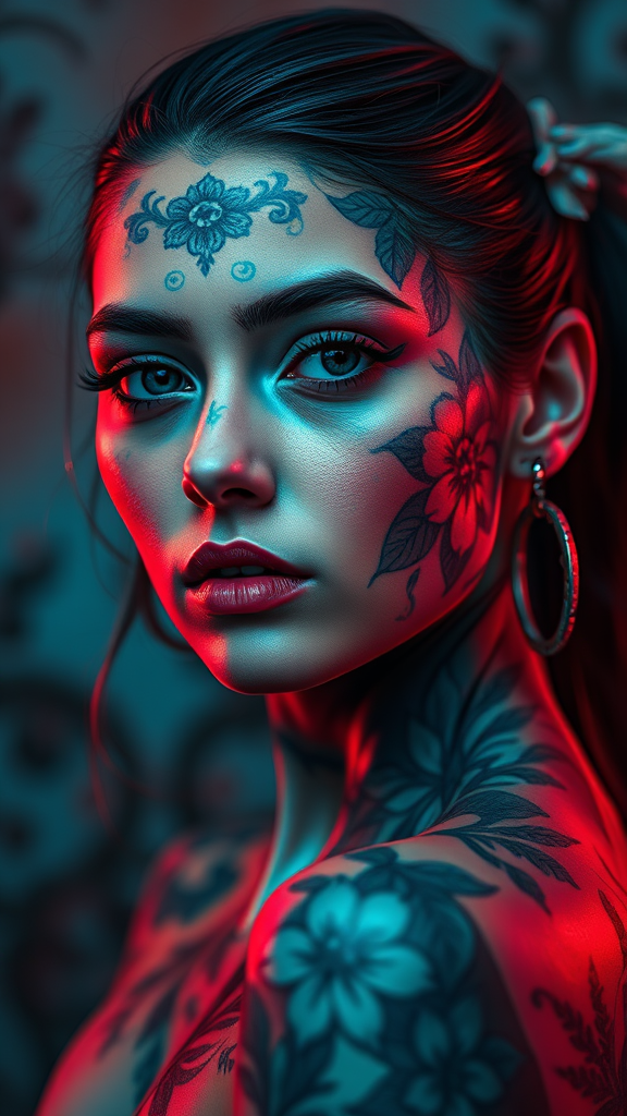 A renowned tattoo artist adorned with vibrant blue tattoos intertwined with intricate floral patterns on her skin, embodying a blend of futuristic fantasy. Her intense gaze captures the viewer's attention, set against a backdrop of oil portraiture techniques. The composition bathes in hues of light red and teal, creating a vivid contrast, reminiscent of rococo elegance. The atmosphere is both dark and explosive, featuring a tattooed woman confidently posing as though in a dramatic photo shoot. This imagery channels the digital manipulation styles of Tanya Shatseva and Daniel F. Gerhartz, with an emphasis on dark pink and light blue tones. The scene is richly detailed, presented in ultra-high definition, echoing the sophistication of fine oil portraitures.