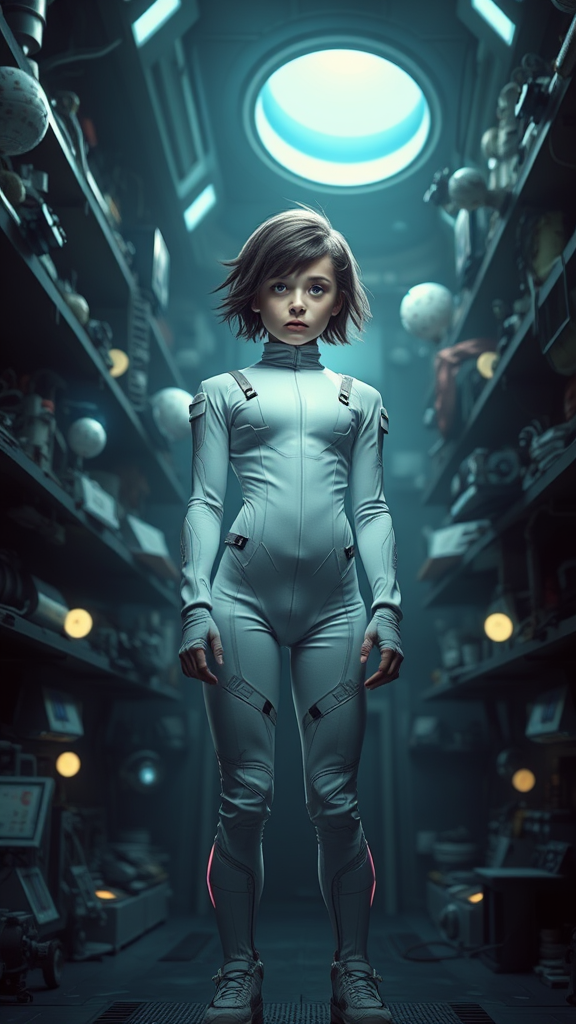 A cold, futuristic scene within a sci-fi spaceship interior features a young girl in a white, tight, sci-fi jumpsuit. Her hair, styled in a cyberpunk manner, flutters slightly as she stands with a cold expression in a multi-storey cold, gloomy room. The environment is a mix of sharp angles and dark shadows, decorated with many small details creating a sense of gigantism. Muted colors prevail with accents of blue and bright lumen from a single angle, casting dynamic illumination throughout the space. The design includes round elements and makes use of blurred backgrounds to highlight the hyper-detailed foreground. Clumps of energy are suspended around her, occasionally flashing with light. In a third-person perspective, this portrait emphasizes a round illumination highlighting her form. The elements are futuristic, with a hint of distortion and surrealism, echoing the cyberpunk aesthetic. Despite the potential for deformations and mutations, the core of the character remains clear and coherent, situated within a creatively disfigured yet compelling sci-fi world.