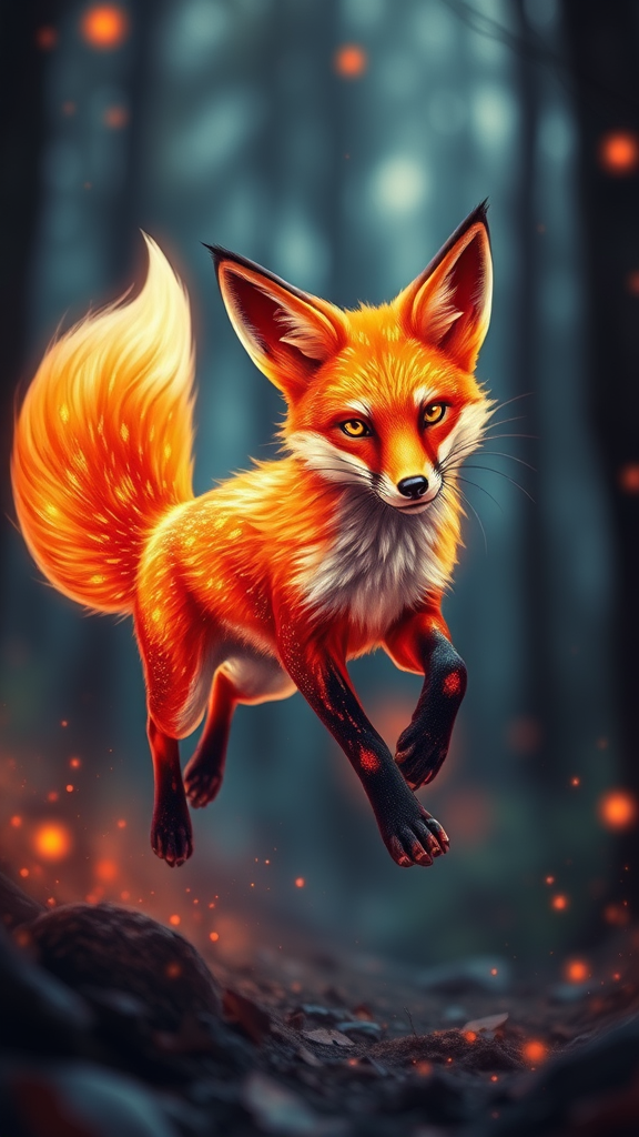 A vivid, lifelike fox with a coat of fiery orange and red hues, its fur detailed with intricate, shimmering patterns reminiscent of dancing flames, eyes glowing with a bright intelligence. It moves with fluid grace, its tail swirling behind it like a brushstroke of ember, portraying the spirit of speed and curiosity. The fox’s sleek body reflects a spectrum of warm colors as it darts through a digital forest, leaving trails of light that echo its movements in the air, embodying a guardian of exploration and the essence of the digital world.