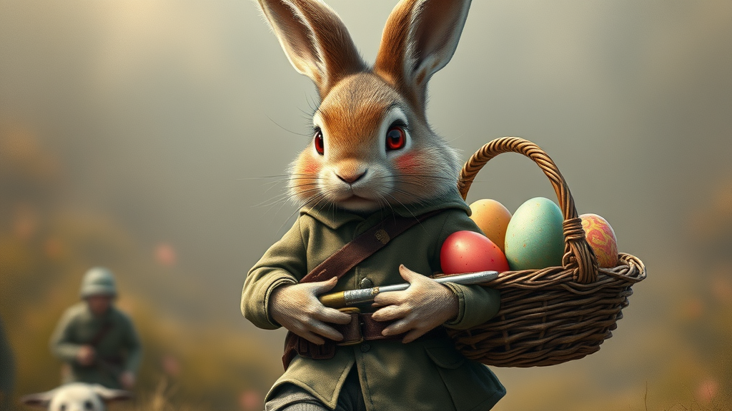 A highly detailed portrait of a cute bunny warrior, striding confidently with a basket full of vividly colored eggs. This male bunny has a rugged appearance, clothed in a WWII uniform, the fabric worn and rugged. His fur, full and fluffy, is tinged with red blood stains, hinting at battles fought to protect his precious cargo. His eyes, an intense shade of red, glimmer with determination. The scene is a juxtaposition of innocence and bravery, the bunny's soft fur contrasting with the harshness of his uniform and the vividness of the eggs he guards. The setting suggests a mix of historical warfare and whimsical fantasy, with the bunny embodying the spirit of a steadfast guardian, unwavering in his mission.