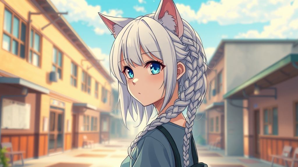 A captivating anime girl standing solo, her young adult form fully visible against a hyperdetailed school background. She has medium-length, intricately braided white hair with adorable cat ears. Her stunning blue eyes convey a hint of anxiety, captured in a side view shot from the waist up. This piece features thick lineart and hyperdetailed natural light, showcasing detailed reflections and volumetric lighting. The illustration is a maximalist photo artwork at 64k resolution, bursting with vibrant, rich deep colors. It is masterfully crafted with an intricately detailed composition resembling a vintage show promotional poster. The scene radiates glamour in anime and fantasy art styles, highlighted by exquisite brush strokes. It's a hand-drawn digital art render with glow effects, expertly combining anatomy and aesthetics akin to the works of Studio Ghibli and renowned artists like Ed Blinkey, Jeremy Mann, and Greg Manchess. This hyperrealistic, cinematic masterpiece is trending on platforms such as ArtStation and CGSociety, showcasing vivid colors, a dramatic focus, and sharp, intricate details.