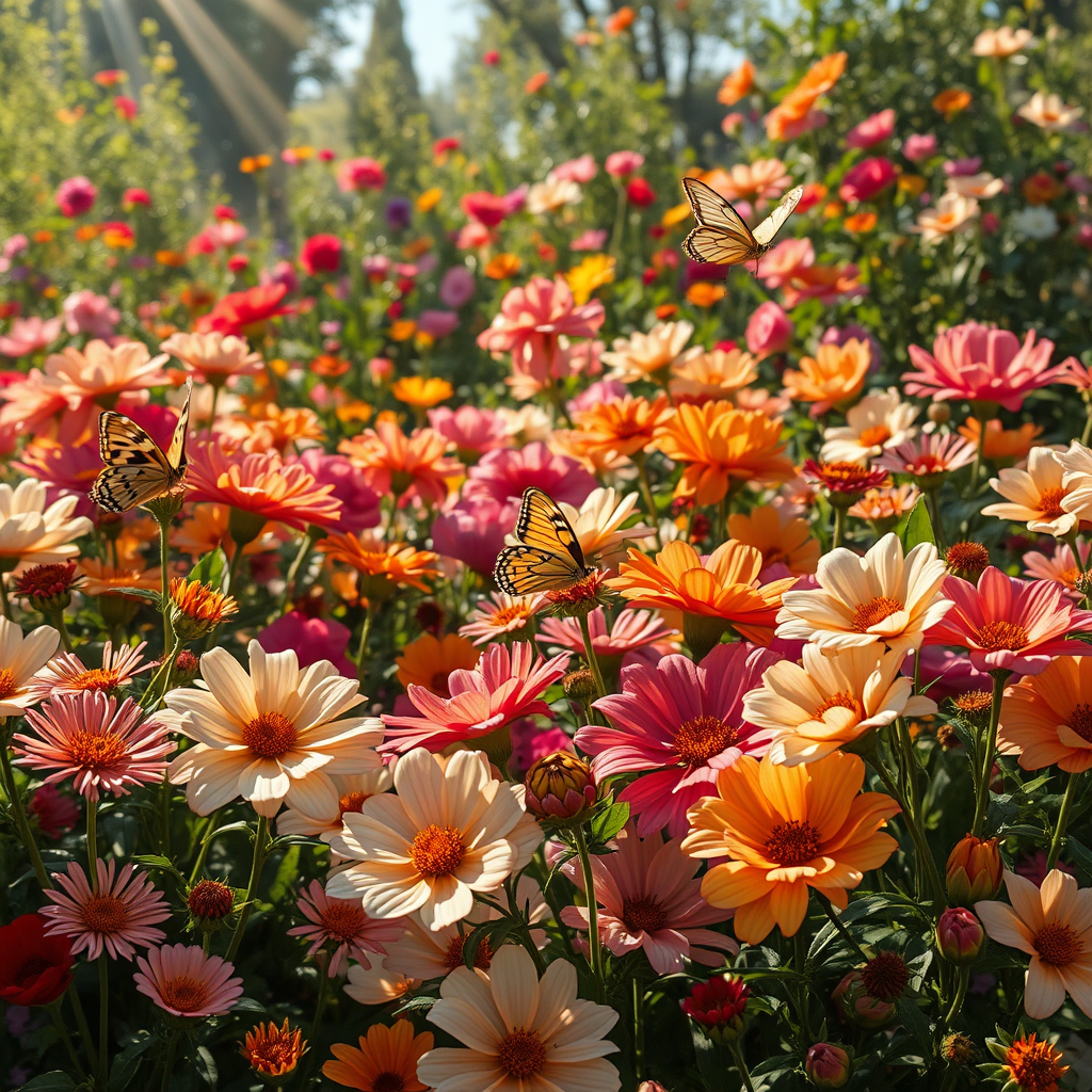 A vibrant landscape teeming with an array of blossoming flowers, each petal intricately detailed and vivid, reminiscent of the lush garden scenes by Paulina Góra and the delicate, botanical precision of Rachel Ruysch. Sunlight dances across the petals, casting a warm, golden glow that enhances the vivid colors. Butterflies flutter gently amidst the blooms, adding a touch of whimsy to the idyllic setting. The garden, a harmonious blend of nature's abundance and artistic expression, invites viewers into its serene, floral paradise.