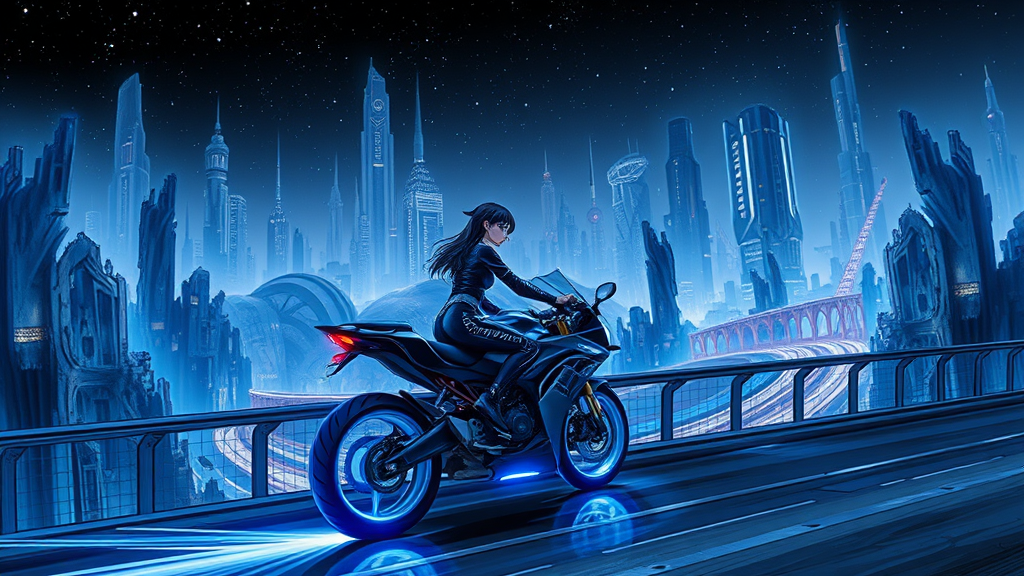 In a futuristic landscape, a girl clad in a snug sci-fi jumpsuit navigates a sleek motorcycle across a bridge, her gaze fixed on the sprawling ruins of an enormous sci-fi city with towering skyscrapers. The ambiance is dark and reminiscent of Akira and Tsutomu Nihei’s ABARA style, with elements of gigantism casting an imposing presence. The multi-layered urban sprawl features a futuristic design, as her neon-lit motorcycle emits a radiant glow, trailing vibrant blue energy plumes. The scene unfolds under a starry night sky, its manga-inspired graphics and dark exposure enhancing the atmosphere. Blue tones dominate the setting, creating a high-definition, intricate anime drawing in 8K resolution with an expansive aspect ratio of 16:9. The motorcycle's plasma trails lick the air with electric intensity, bathing the scene in ethereal blue light, capturing the essence of a sci-fi epic.