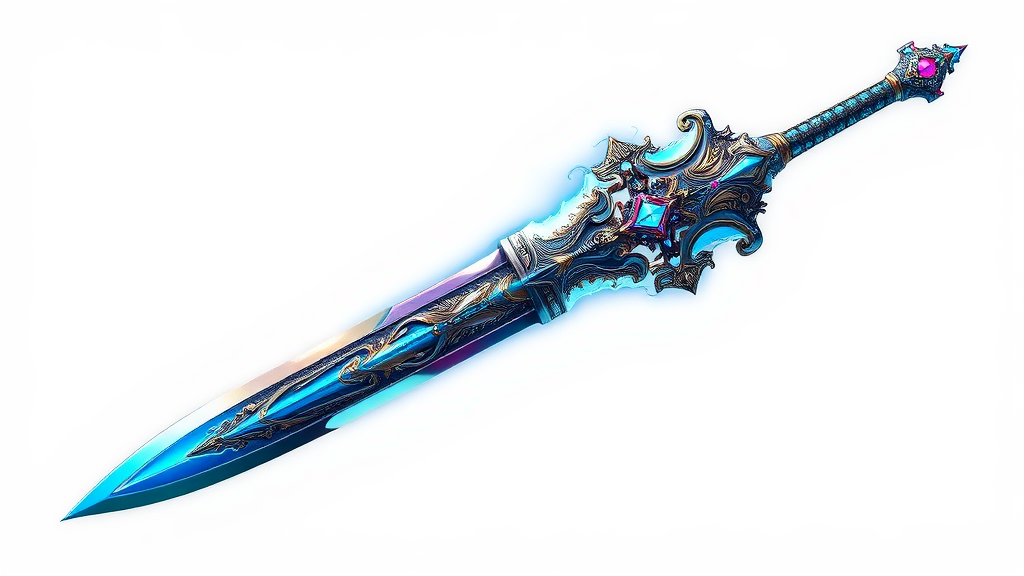 A breathtakingly intricate magic sword designed as a high-quality video game asset, featuring a sleek blade with stunning iridescent hues and a captivating blue glow. Rendered in a detailed fantasy illustration style with octane quality and high sampling, the sword showcases ornate engravings and gemstone embellishments that catch and reflect light beautifully. Set against a pristine white background for isolation, this fantasy masterpiece is trending on art platforms and evokes a sense of mystical allure and unparalleled craftsmanship.