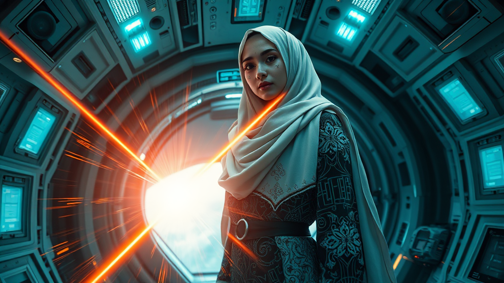 A Hijabi Muslim girl adorned with cyberpunk prosthetics, wearing an intricately designed Islamic dress, stands inside a futuristic spaceship. Her long hair flows elegantly, blending with the ambient glow of the ship's interior. The setting exudes sci-fi elements with hyper-detailed visuals, as a laser beam pierces the center of the scene, connecting with another laser from the sky. Surrounding her are dynamic energy clots, creating a sense of acceleration. The environment is captured in photorealistic quality, with hyper-realistic textures accentuated by a burst of light flash. The scene is painted in 8K ultra-high-definition, exhibiting super resolution with a cinematic flair. Long exposure effects emphasize speed and motion in this hyper-realistic depiction, enhancing the immersive experience of this highly detailed sci-fi landscape.