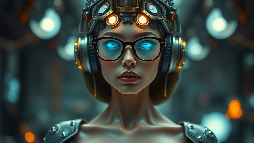 mechanics, cyborg girl, nuclear art, gloss, depth of field, super detail, cinematic, cyberpunk lighting from multiple sources, cinematic lighting, Mitakon Speedmaster 65mm, ISO 100, glasses, mugs, headdress, flat chest, slender build, glowing elements, piercing, light accents, hood, bright highlights, headphones, bare neck, skinny, narrow hips, heels, radiant light, gold accents, rivets, intricate design, folded posture, duality in features, conceptual art, abstract components, blurred lines, unique anatomy, artistic distortion, surreal proportions, rich textures, muted tones, layers of color, enigmatic expression, imaginative display, subtle lighting, symmetrical balance, creative depth.