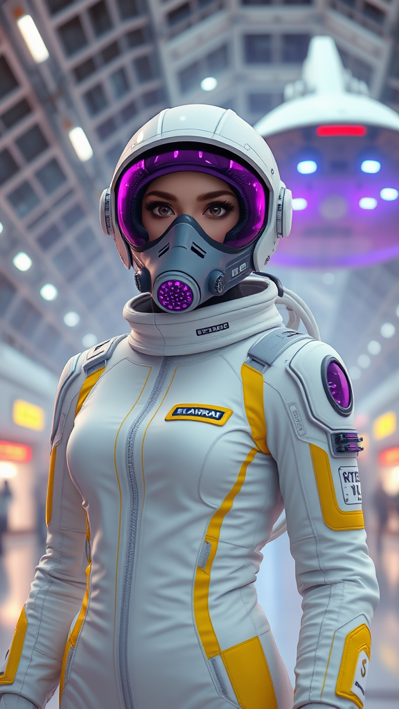 Female astronaut adorned in a sleek, white and yellow detailed jumpsuit stands poised in a bustling spaceport. A ship majestically ascends in the background. Her face is obscured by a futuristic mask complemented by a translucent purple sci-fi visor and a high-tech respirator, all capturing the imagination with their intricacy and realism. This scene, trending on art platforms, is rendered with extreme attention to detail, featuring a cinematic composition that exudes masterpiece quality. The environment is stunning and awash with color, creating a surreal, almost divine ambiance. The atmosphere evokes the grandeur of manga and anime, with meticulous detailing and intricate shadows brought to life through cinematic lighting. It floats between hyperrealism and fantasy, seemingly crafted with the power of Unreal Engine 5, complete with lumen reflections, CGI elements, and a flawless 3D craft aesthetic. The figure exudes doll-like perfection, brilliantly executed with precision akin to an Octane render. Exploring beauty and wonder, it avoids imperfections, focusing instead on otherworldly elegance and seamless human form.