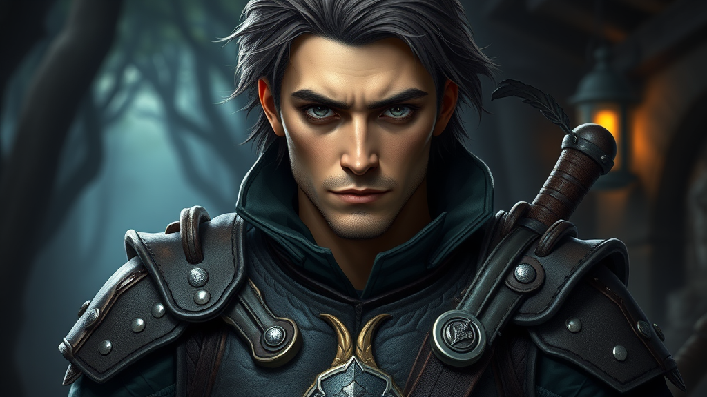 A stunning portrait of a male rogue character in a fantasy RPG setting, featuring highly detailed and symmetrical features, capturing the essence of a dungeons and dragons persona. The award-winning image is a full-body reference sheet with a 16k resolution, showcasing a masterpiece of artistry. The rogue stands confidently, adorned in intricate leather armor with subtle embellishments, exuding an air of mystery and cunning. The background hints at a dark forest or shadowy alleyway, adding depth to the character's story. His piercing gaze and slight smirk suggest both charm and danger, embodying the classic elements of a D&D rogue.