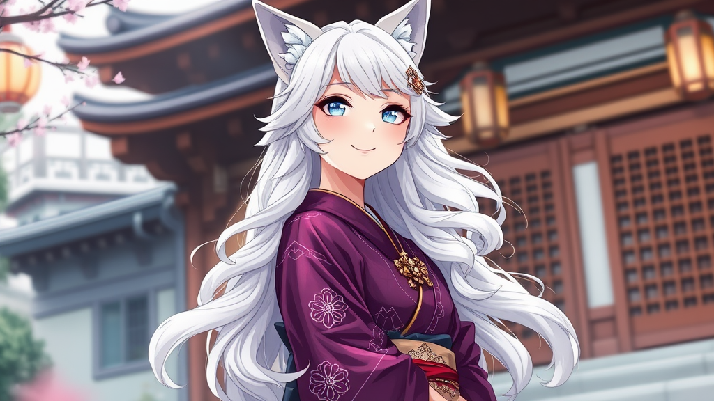 A joyful and enchanting white-haired anime wolf girl in a deep purple kimono, her wavy locks cascading gracefully around her. She stands in a beautifully designed portrait with a radiant, charming face, enhanced by soft lighting and a touch of magical blur and flare. Her kimono is intricately detailed, adorned with elaborate accessories that speak of elegance. She strikes a graceful pose, her expression serene and captivating, against the backdrop of an exquisitely detailed traditional Japanese building. The scene is hyperdetailed, capturing every nuance, creating a masterpiece that is a visual feast, comparable to artwork trending on platforms like pixiv, rendered in stunning 4k and 8k resolution.