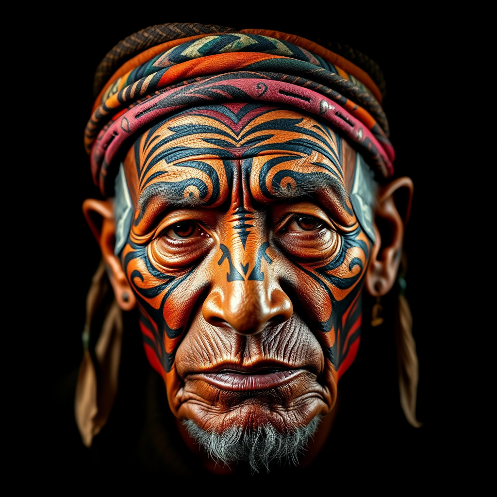 A tribal elder with intricate face tattoos exudes wisdom and strength, captured in a stunning photographic masterpiece. Set against a deep black background, the colorful detail and realism of the artwork bring the elder's features to life, showcasing their beauty and unique cultural heritage. This top-quality, breathtaking piece reflects a perfect harmony of aesthetics and artistry. A blend of vibrant colors and expertly crafted elements transforms the image into an extraordinary collage, subtly branded with the artist's signature and logo.