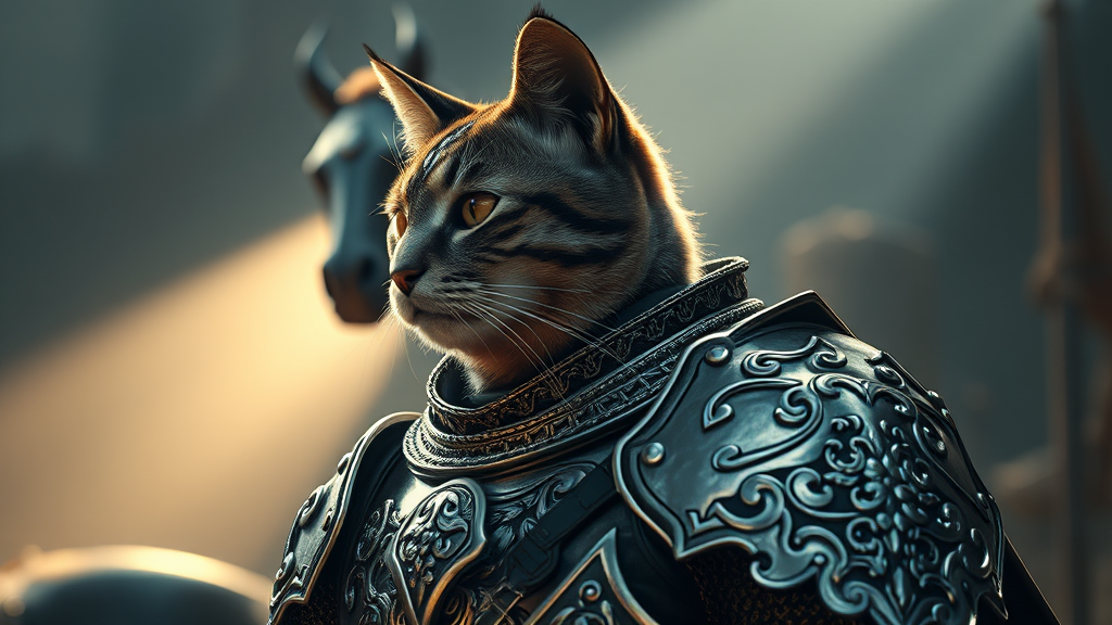 A cinematic portrait of a cat knight in finely detailed armor with intricate designs, shimmering in silver and adorned with silk accents. The scene is illuminated by dramatic lighting, enhancing the meticulous craftsmanship of the armor. In the background, a dangerhorse stands majestically, adding an element of tension to the composition. The image boasts a 4k resolution, capturing every nuance and detail while incorporating subtle creative variations.