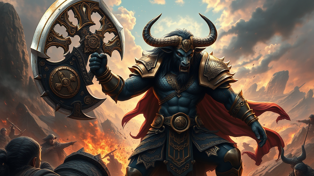 Artistic depiction of an awe-inspiring Minotaur deity wielding a massive axe, in the midst of battle, adorned in intricately designed black and gold armor emitting a foreboding dark aura, captured as if by a high-resolution Nikon D750, showcasing an elaborate, elegant digital illustration with a stunning scenic backdrop, hyper-realistic and hyper-detailed, designed to be viewed in ultra-high-definition 8k.