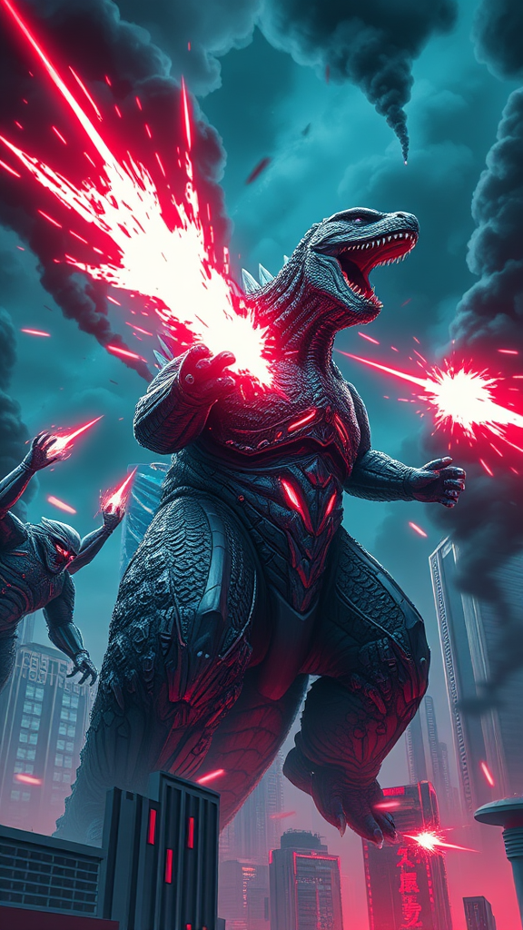 High ground angle shot reveals skyscrapers on low ground, where an enraged, roaring King Kong Godzilla stands amidst futuristic organic-armored creatures radiating a white and red aura, unleashing powerful attacks. The scene is bathed in neon light, depicted in detailed anime style with fw murano influences. Full-body GALAXY armor glistens with intricate designs. Jet black smoke plumes rise dramatically. Created in the style of Prokoko, focusing on bold, expressive brushstrokes and vivid colors. The CarnageStyle modifier brings a blood-red intensity of 1.6. Cinematic lighting enhances the dynamic angle, showcasing extreme attention to detail.