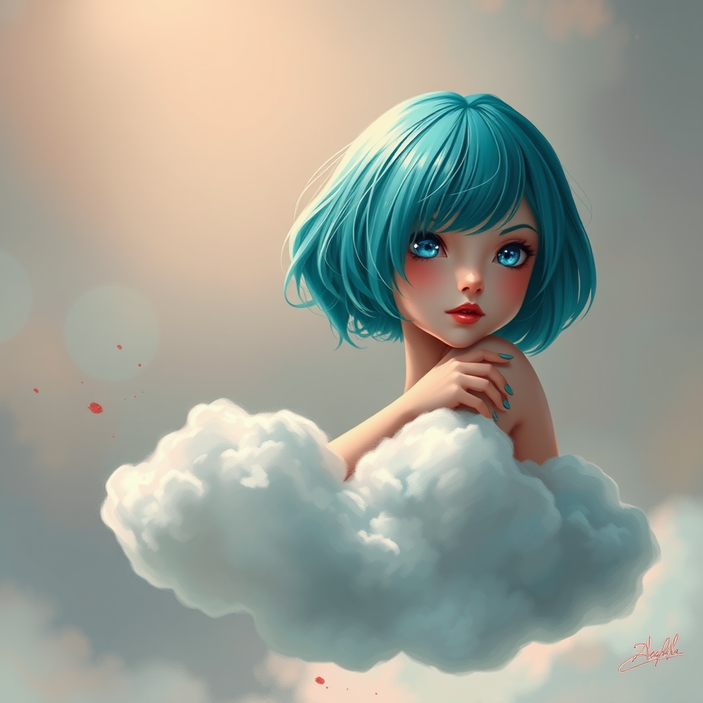 A young girl with bright, short turquoise hair and striking cerulean eyes is perched elegantly on a silvery cloud, surrounded by a soft, ethereal glow. Her presence is that of a celestial being, anime-inspired with intricate and delicate detailing. Her expression is serene yet intense, with an air of mystery. The scene is hyper-detailed and elegant, capturing both beauty and subtle hints of the macabre with faint crimson splatters that contrast against the soft, dreamy background. The digital painting is smooth and sharp in focus, reminiscent of the styles of Artgerm, Greg Rutkowski, and Alphonse Mucha, blending their distinctive elements into a cohesive masterpiece. The cloud beneath her is textured like a wisp of silk, curving gently around her form. The composition combines intricacy and elegance in an exquisite tableau, where fantasy and gentle danger coexist.