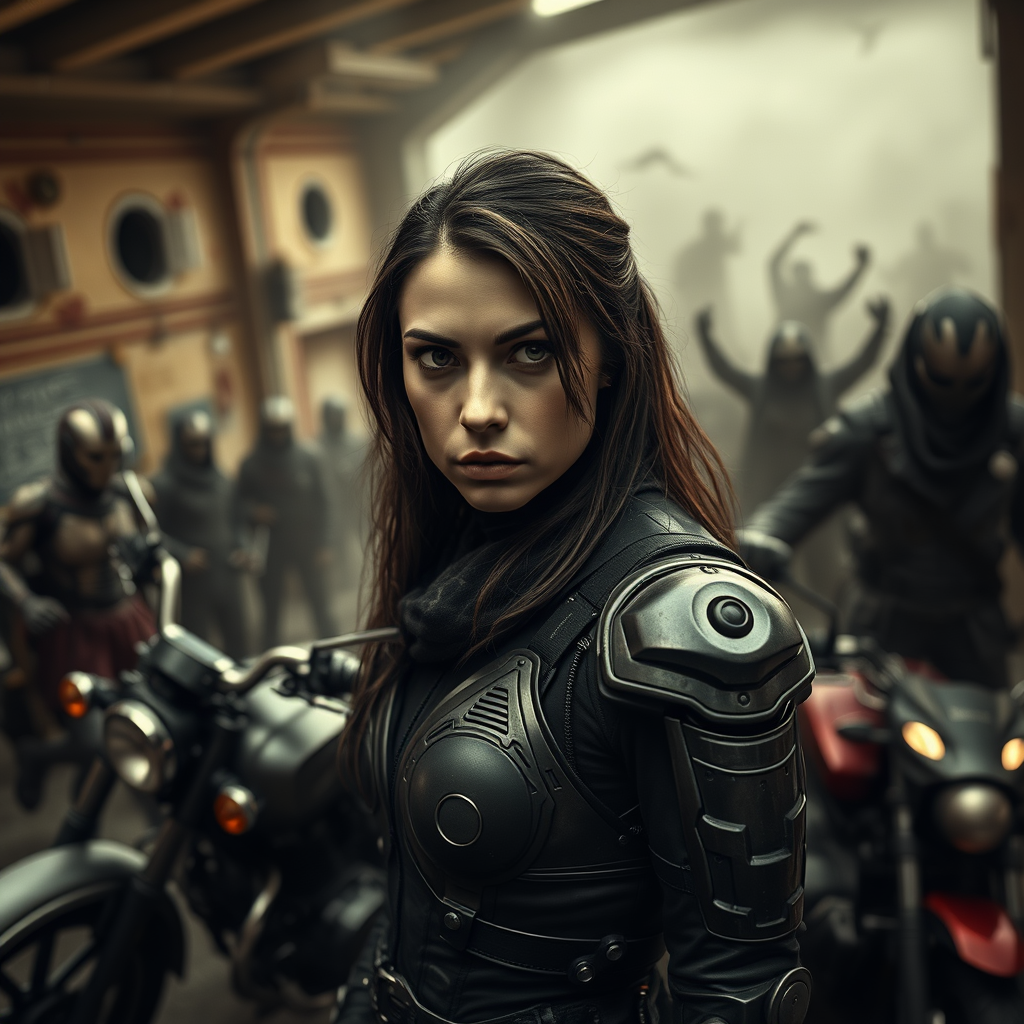 A dynamic scene unfolds against the backdrop of a city besieged by a zombie outbreak, where one woman stands as a mysterious figure, clad in The Armor of Blood. Her portrait captures a three-quarter close-up, her expression intense and focused. The setting juxtaposes the eerie silence of a Provence-inspired classroom against the cold, metallic interiors of a space station. Amidst this chaos, the romantic echoes of the 1920s seep through, with two shadowy figures juxtaposed, their faces eerily similar yet subtly distinct, hinting at the uncanny world of clones. The image captures a spectrum of elements: from an Ironman-inspired motorbike parked nearby, ready for a swift escape, to the defiance in her eyes, suggesting tales untold. She stands amidst a landscape painted in muted sepia tones, reminiscent of an old photograph, yet vibrant in its storytelling. Mysterious anomalies swirl around, such as faint outlines of blurred figures and out-of-focus details, crafting a narrative steeped in mystery and imagination. The scene speaks volumes through its contrasts — the ruggedness of the biker aesthetic versus the delicate intricacies of pointed footwear, whispers of eras past blended with futuristic visions, capturing an essence that is both timeless and vividly unforgettable.